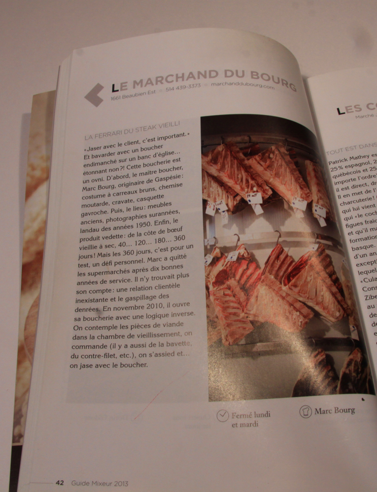 Il n'y a pas de présentoir réfrigéré ni comptoir libre-service au 161 rue Beaubien Est. Cela peut paraître curieux, lorsqu'on pense avoir mis les pieds dans une boucherie. C'est que Le Marchand du Bourg n'est pas une boucherie ordinaire... |