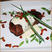 Du tendre filet mignon arrosé d'une sauce savoureuse au gorgonzola et garni de miettes de bacon croustillant et d'oignons verts.